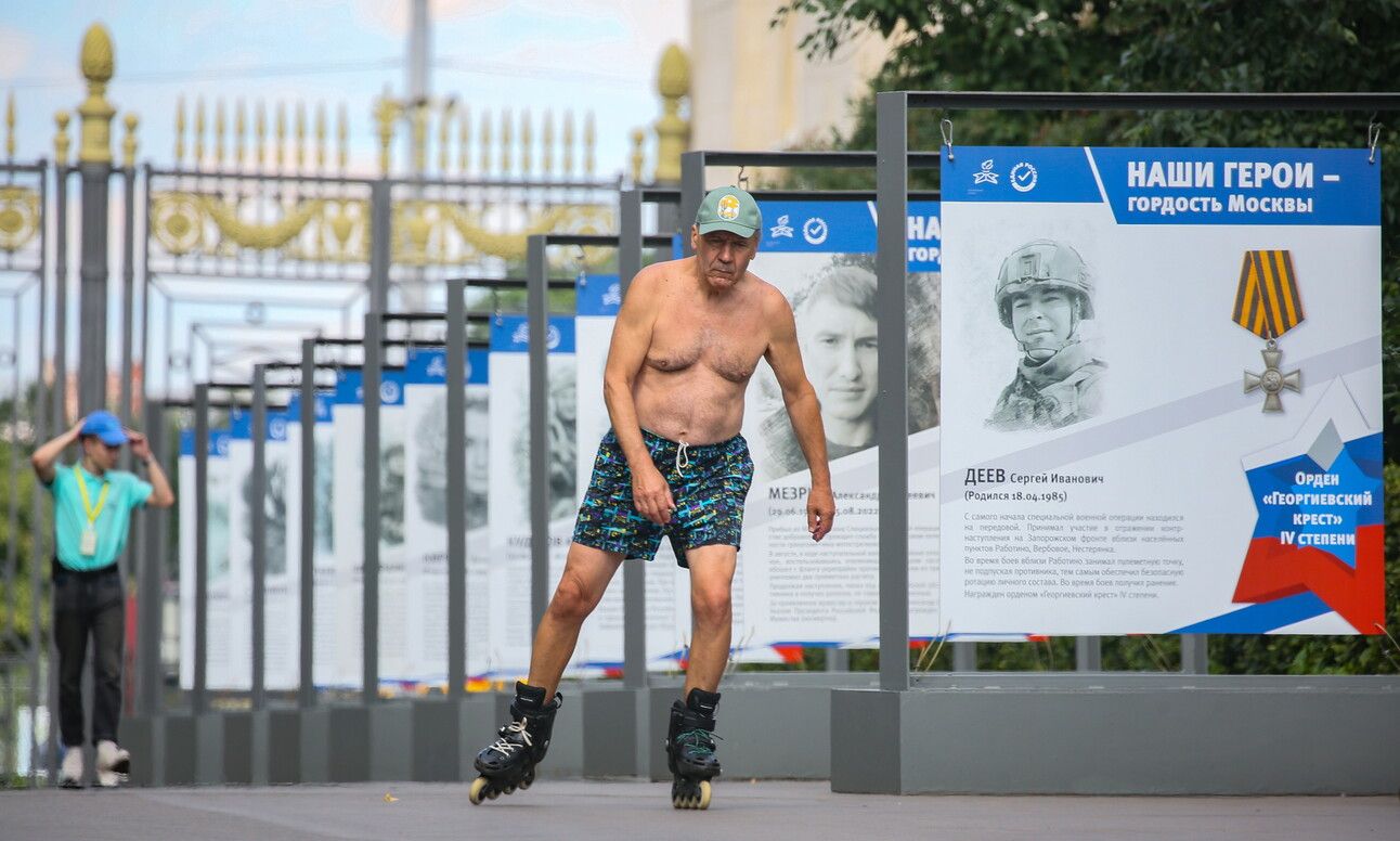 Un bărbat se dă cu rolele lângă postere cu soldați ruși în centrul Moscovei, unde temperaturile au ajuns la 28 de grade zilele trecute. Foto: Agerpres
