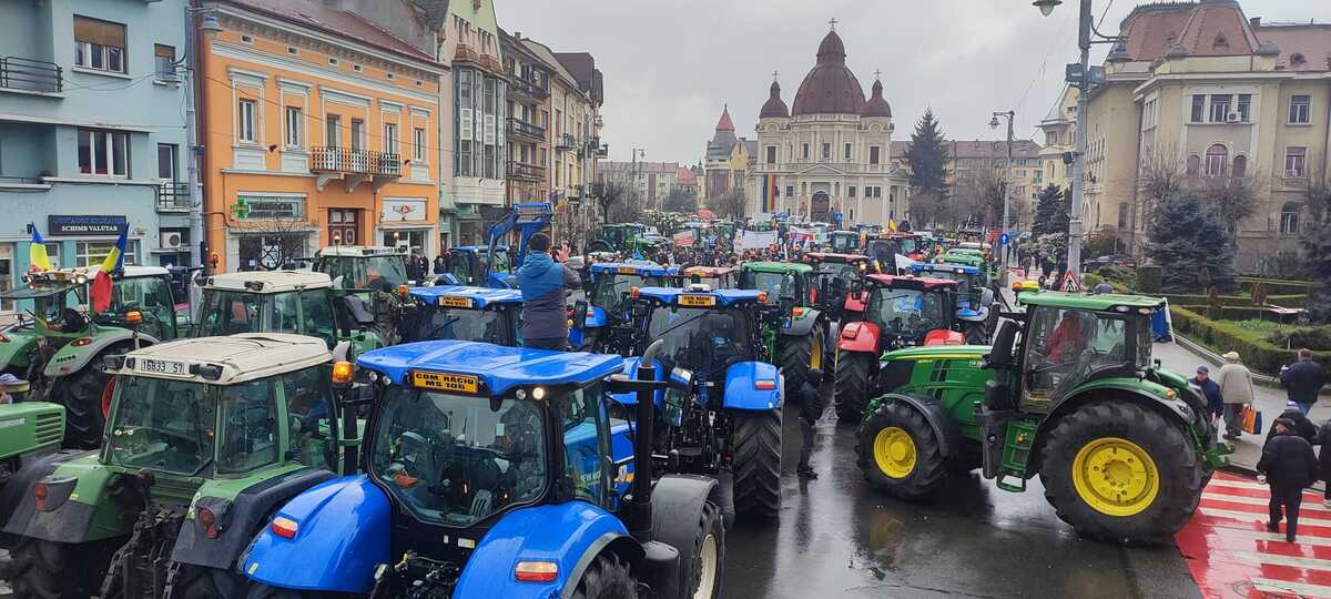 Supărați de prețurile mici ale cerealelor din Ucraina, fermieri români au scos tractoare pe mai multe șosele din țară. Aici blochează circulația în Târgu Mureș. Foto: Valentin Spingos