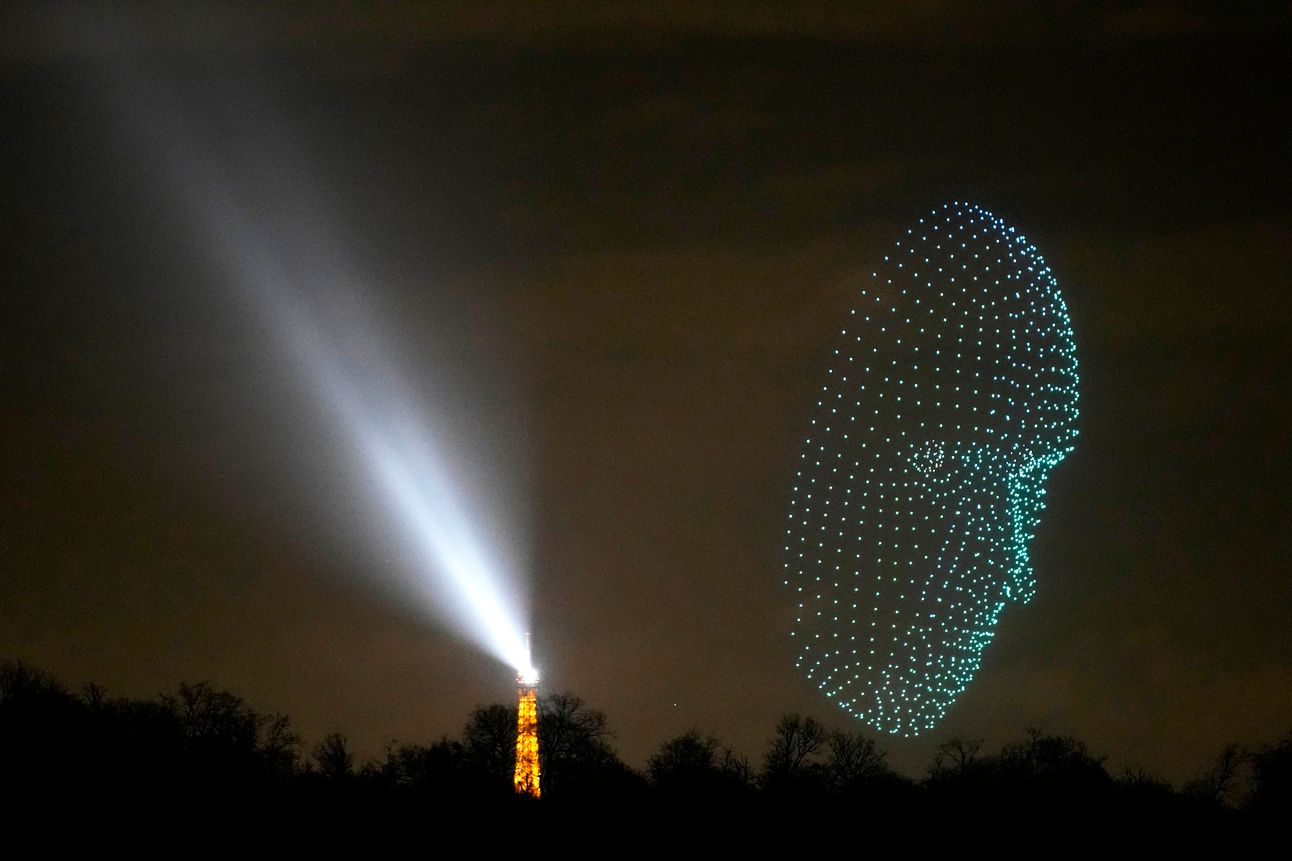 Un spectacol luminos cu drone în apropierea Turnului Eiffel din Paris. Foto: AP Photo/Christophe Ena