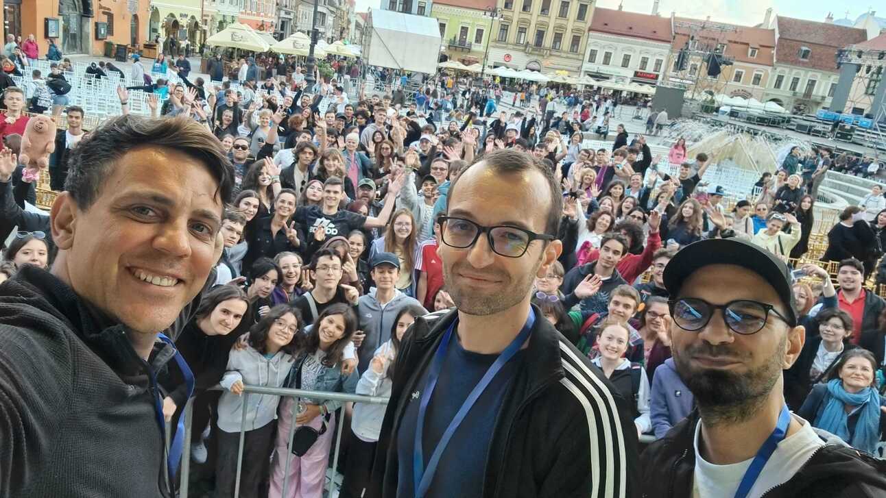 Această fotografie este făcută în Piața Sfatului din Brașov, la Festivalul Boovie, unde participă elevi din toată țara. Copiii și adolescenții pe care îi vedeți în spatele nostru, cei trei jurnaliști Recorder care am fost prezenți la eveniment, au vârste cuprinse între 10 și 18 ani. Profesorii implicați în organizare ne-au spus că una din principalele dorințe ale elevilor pentru ediția de anul acesta a fost invitarea echipei Recorder. A fost unul dintre cele mai frumoase complimente pe care le-am primit vreodată, iar prezența la acest festival - una dintre cele mai frumoase experiențe.