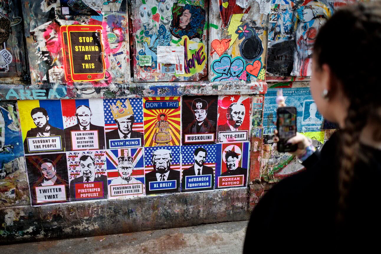 O serie de postere cu lideri politici pe un perete din Londra. Foto: Agerpres