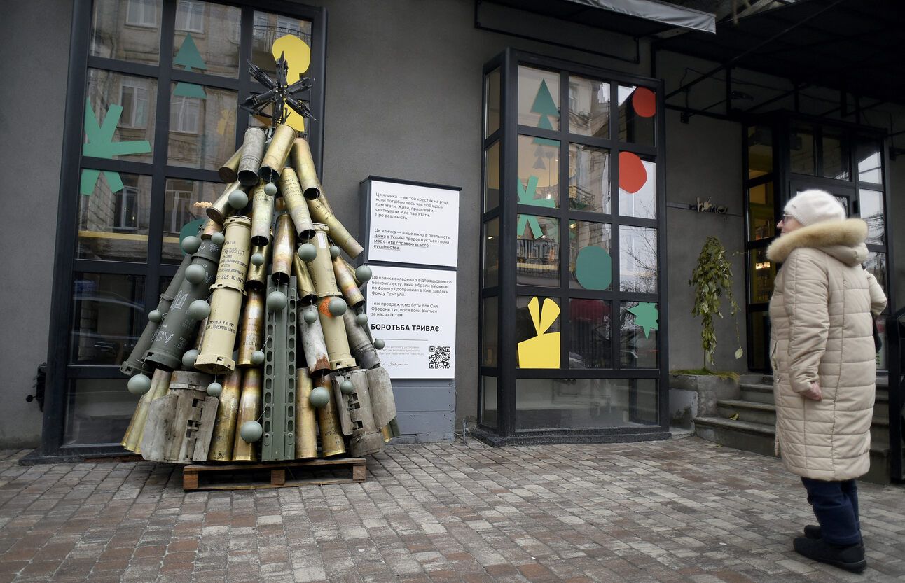 Un pom de Crăciun încărcat cu muniție, în preajma unei cafenele din Kiev. Instalația este menită să le reamintească locuitorilor că războiul continuă și trebuie să devină o cauză comună a societății. Foto: Kaniuka Ruslan/Ukrinform/ABACAPRESS